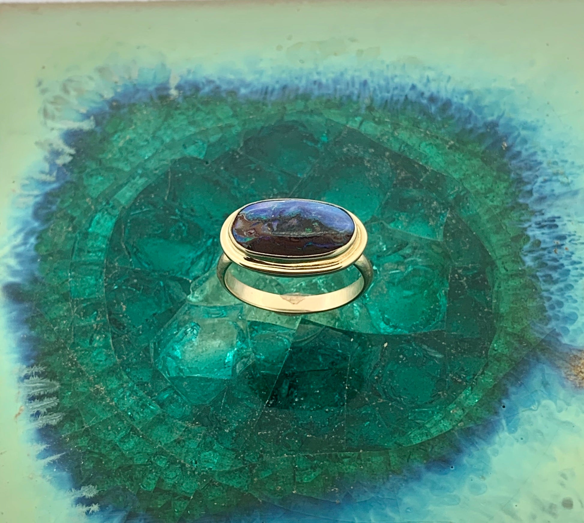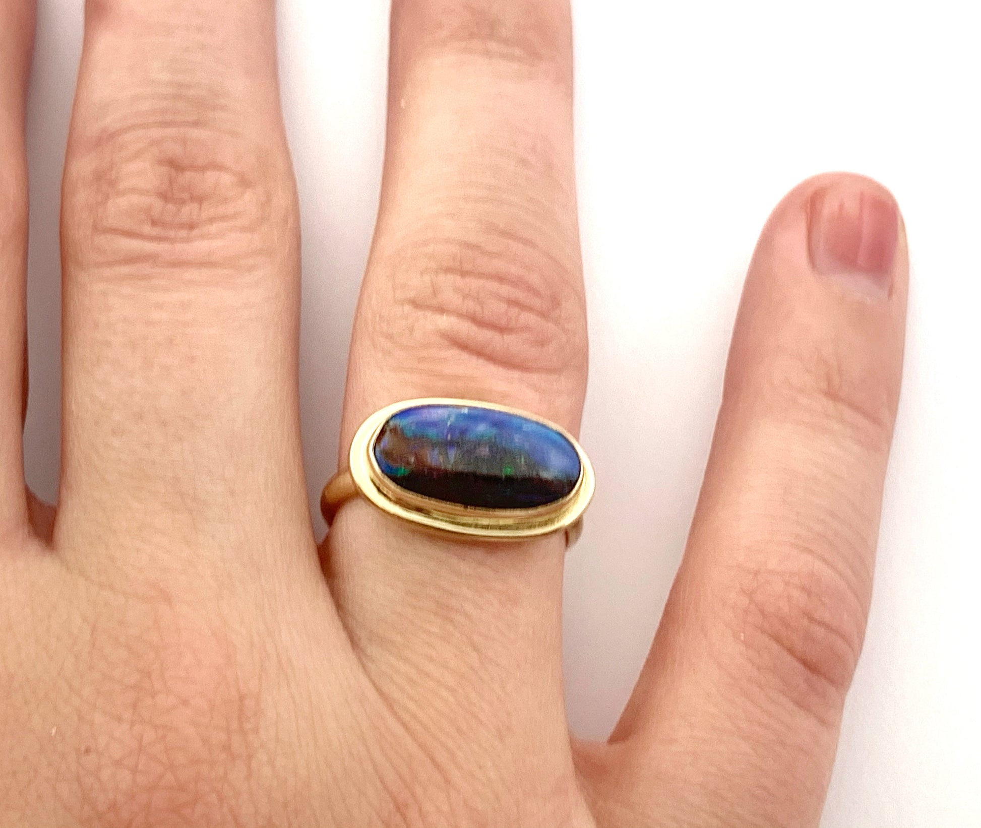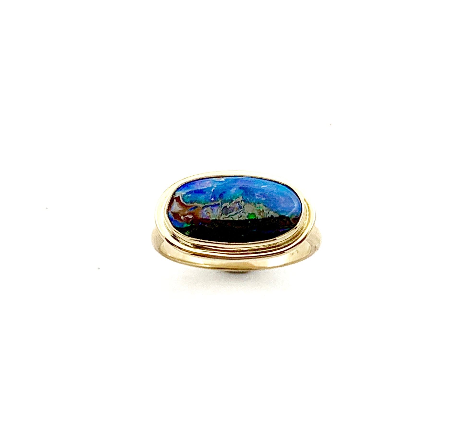 Australian Opal Gold Ring, Solid Opal Statement Ring, OOAK Gemstone Ring, October Birthstone Ring in 14k, Landscape Opal Ladies Ring