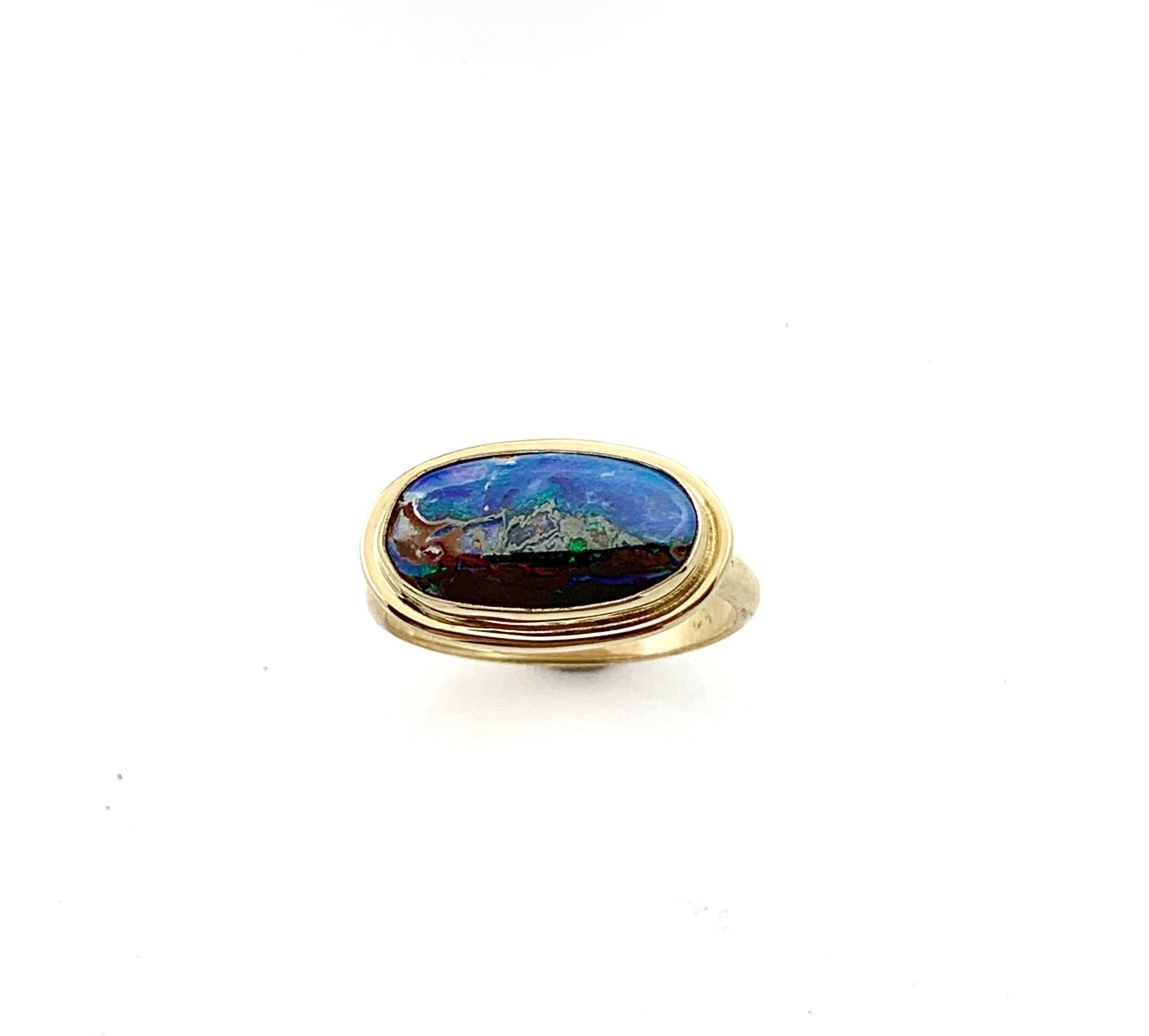 One of a kind scenic Australian Opal set in 14k gold. This beautiful stone measures 16mm long by 8mm wide and is set in a 3mm wide gold bezel. This opal is a solid opal, not a doublet or triplet. Looking closely, it resembles a mountain scene with a bright blue sky. There are tiny green flecks in the brown that add extra sparkle. Truly one of my favorite opals! This ring is a size 6.75 and can be stretched to a 7.25. If either of these are not your size, I have a large collection of beautiful opals you to choose your own opal and have a custom size ring made to fit you perfectly.