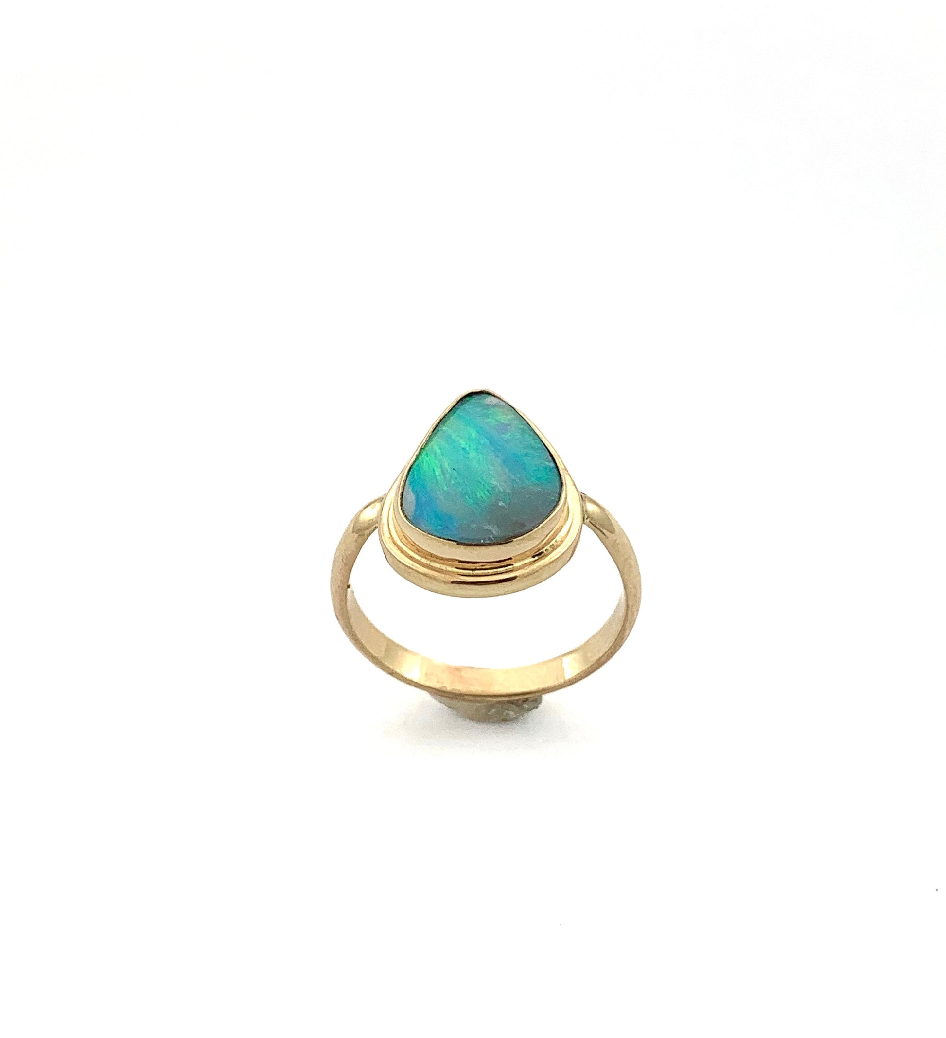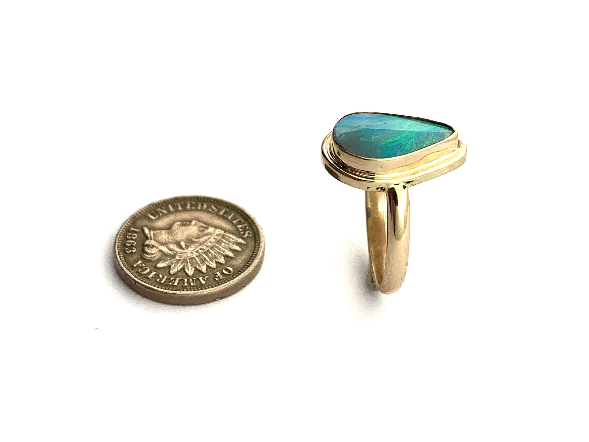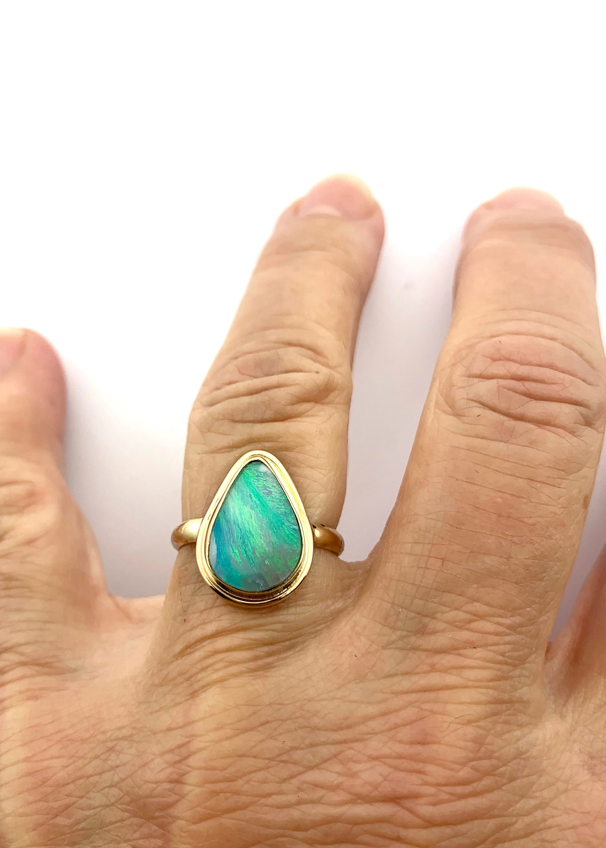 Beautiful, one of a kind, solid Australian Opal set in a custom made 14k gold setting. This gorgeous and completely natural opal measures 14mm by 9mm. The 14k gold bezel is 2mm wide and there is a small border beyond the bezel to both finish the design and offer the stone some protection. The 14k band is 2.5 wide. This ring is a size 6 and can be stretched to a size 6.5. If either of these are not your size, I have a large collection of beautiful opals for you to choose from so I can make you a ring that fits you perfectly.